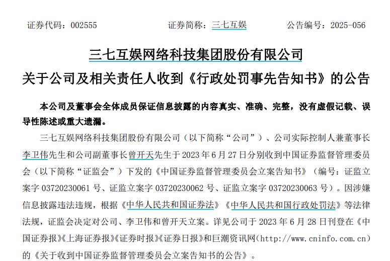 中新经纬11月1日电 10月31日晚间发布公告称,公司董事长李卫伟、副董事长曾开天等6人,收到中国证监会出具的《行政处罚事先告知书》(处罚字[2025]71号),三七互娱及6名相关责任人拟被罚款合计3255万元。