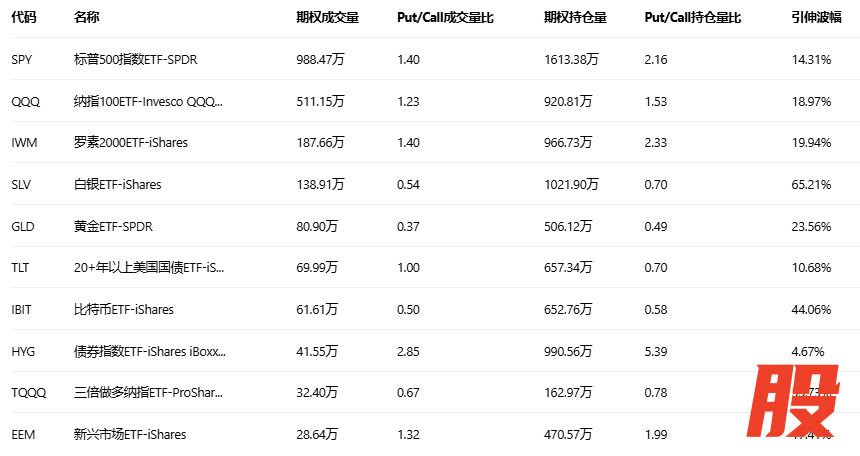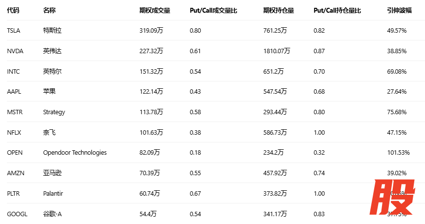 引申波幅排行榜(标的市值>10亿美元,且期权成交量>10万)