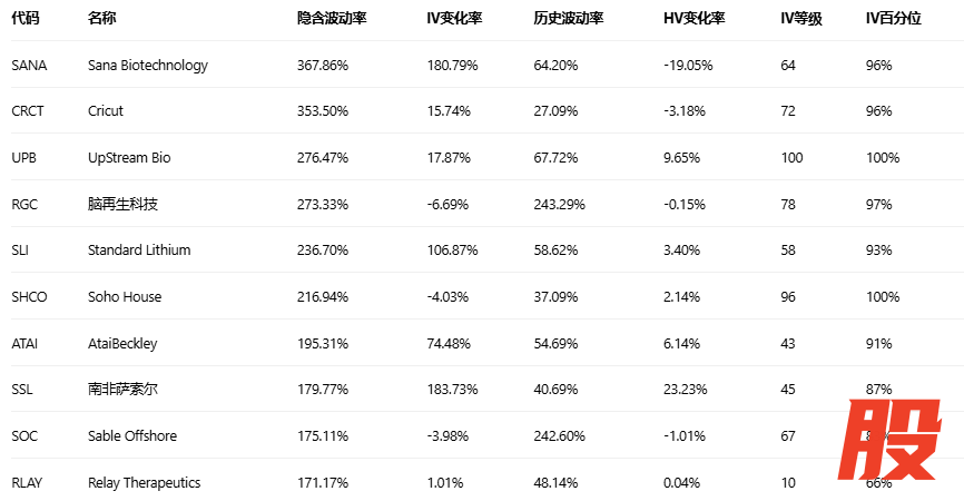 美股期权波动率排行榜前十(标的市值>100亿美元,且期权成交量>10万张)